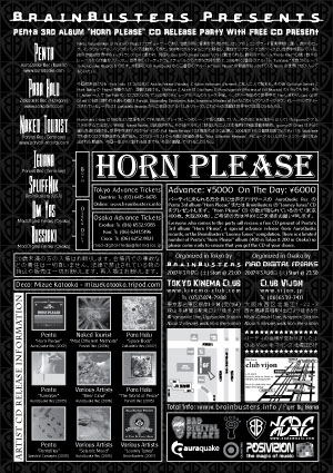 Everyone who comes to the party will receive a free CD present of Penta's 3rd album "Horn Please", a special advance release (worldwide release date is 03/30) from AuraQuake records. There are a limited number of the ''Horn Please'' album (400 in Tokyo & 200 in Osaka) so please come early to ensure that you get one. Don't miss your chance to get this CD almost 2 weeks before the worldwide release date!