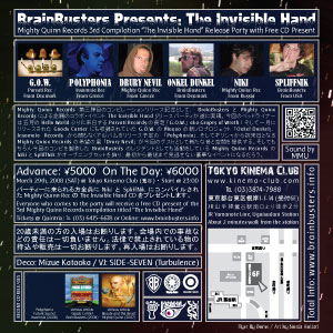 リンク: brainbusters.info | 前のパーティ情報と写真 | ゲストブック | 登録 | 取り消し The Invisible Hand Mighty Quinn Records 3rd Compilation CD Release Party with FREE CD Present FLYER: ![]() ![]() Click to Enlarge DETAILS: 東京キネマ倶楽部 (Tokyo Kinema Club) 2008年3月29日(土) ・ 2008.3.29 (SAT) スタート23:00 ・ Start 23:00 前売り5000円、当日6000円 ・ Advance: 5000Yen, Doors: 6000Yen PARTY INTRO: FREE CD PRESENT: Everyone who comes to the party will receive a free CD present of the 3rd Mighty Quinn Records compilation titled “The Invisible Hand” ARTISTS: ![]() G.O.W. aka GRAPES OF WRATH (Parvati Rec / Denmark) ![]() POLYPHONIA (Insomnia Rec / Greece) ![]() DRURY NEVIL (Mighty Quinn Rec / Greece) ![]() ONKEL DUNKEL (BrainBusters / Denmark) ![]() NIKI (Mighty Quinn Rec / Russia) ![]() SPLIFFNIK (BrainBusters / USA) Decoration: MIZUE KATAOKA (mizuekataoka.tripod.com) VJ: SIDE-SEVEN (Turbulence / Tokyo) PA: MMU ACCESS: